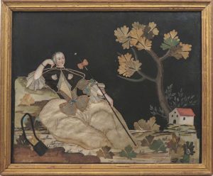 Image habillée sur fond noir, s.l., XVIIIe s., 2 pcs. Sujets divers. Tissu, papier. Cadres moulurés dorés, 25 x 30,5 cm ou 30 x 25 cm.