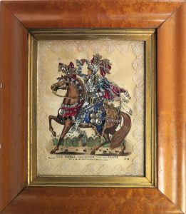 Skelt : The royal champion with the cup, 2 copies (but diff. orn. : one large size, spectacular, the 2nd one trimmed, less decorated). - The royal champion with the glove (large, spectacular). - St. David of Wales. - Mr. Freer as Hassarac. - Mr. Kean as Othello. - Mr. Hicks as Roderick Dhu. Redincton - Mr. Holloway as Richard the 3rd. - Mr. Creswick as Hamlet. - Mr. Marston as Prince Henry. Park & Golding - Mr. Freer as Romeo. Nice set of vividly col. plates lavishly decorated with glass pearls, sequins, shining stones, scraps of fabric, metallic paper, etc. "Tinsel prints were (...) decorated with scraps of material and tinsel additions. They were popular during the first half of the 19th century and were considered an adult, rather than a child's hobby. By the 1830s it was possible to buy the tinsel, leather and feather ornaments to go with each image".