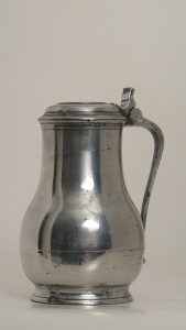 deksel, schelpvormige duimrust. Onderaan merktekens van J. Van Antwerpen (° 1819) : merkteken Antwerpen (kasteel met 2 handen) en intitalen JV/A (D. 730) en gekroonde roos met intialen [J]VA (D. 731). - Schenkkan met platte voet, H 24 cm. Versierd met geometrische en vegetale motieven in relief, rond deksel, schelpvormige duimrust, gietbek. Op bodem merktekens van C. Gobbaerts (meester in 1737) : merkteken Antwerpen (kasteel en 2 handen) en initialen CG (D. 491) en gekroonde roos met initialen CG (niet leesbaar) (D. 492).- Schenkkan op gewelfde voet, rond plat deksel, eenvoudige duimrust, zonder gietbek. H 23 cm. Op bodem merktekens van I.B. Van Camp (meester in 1746): merkteken Antwerpen (kasteel en 2 handen) en initialen IVC (D. 683) en gekroonde roos met initialen IVC (D. 686), inscriptie "(Joannes Vancamp)/Block/Tin" in cart. (D. 685). (4 st.)
