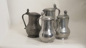 Schenkkan met rond deksel. H 19 cm, grijze patine. Versierde kan en deksel, met gietbek, schelpvormig duimrust, tinnen handvat. Op onderkant  merkteken van F. Dhollander (meester in 1733) : gekroonde roos met initialen FD (D. 1124). - Schenkkan met rond deksel. H 22 cm. Versierd, schelpvormige duimrust, tinnen handvat, schenktuit. Merkteken van J.B. Ryelandt (meester in 1765): gekroonde roos met initialen [B]R (D. 1086). - Schenkkan met deksel. H 17 cm, Met tinnen handvat, schelpvormige duimrust en schenktuit. Op bodem merkteken van J. J. De Proost (meester te Brugge in 1761): gekroonde roos, centraal de Brugse leeuw en initialen PP (D. 1243). - Schenkkan met deksel. H 17 cm, versierd. Met scharnierend handvat en schelpvormige duimrust. Merkteken van P.C. Dewitte (1773-1863) : gekroonde roos, Brugse leeuw en initialen PDW (D. 1218).