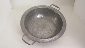 Diepe doopkom, H 8,5 cm, 2 vaste handgrepen versierd met bloemmotief en een gekroonde IHS. Inscriptie op de rand "Xaveria Vankersschaver meter van Coleta Freyne geboren den 9 april 1843 tot Lisseweghe".  Op de binnenkant van de kom merkteken van J....