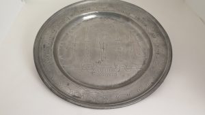 Doopschotel met versierde rand. Diam. 37,5 cm. Geometrische versiering en inscriptie "Marie Anna Willems meter van Marie Teresia Verspringe geboren den 7 april 1793". Plat versierd met een gekruisigde Christus en 2 grote kandelaars. Op de buitenrand...