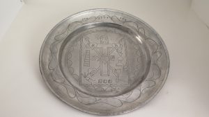 Schotel, diam. 33 cm. Versierd. Eigendomsmerken (?) IMB en IMM, gedat. 1794. In bodem : foltertuigen van Christus "Arma Christi". Op buitenrand : 2 merktekens van Brugge van A. Pavot (1740-1812, meester in 1764) : gekroonde hamer met AP (D. 1074) en...