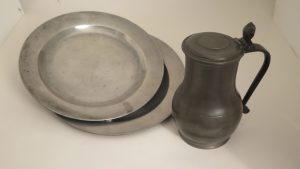 Joint : Pichet sur piédouche. H 18 cm. Orné, poucier en coquille, anse plate en étain. Poinçonnage au fond ext. apposé 2 x : buste d'un évêque mîtré, avec initiales FC/VT (maître non identifié actif entre 1790 et 1830) (D. 1416). (3 pcs)