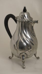 Verseuse tripode. H 33 cm. Corps décoré, bec verseur torsadé, décoré de rocaille, couvercle rond, appui-pouce horizontal, anse en bois. Poinçonnage de J. B. Riemslagh (Breda 1752-Bruxelles 1779) : St. Michel et le dragon, initiales IBRS (D....
