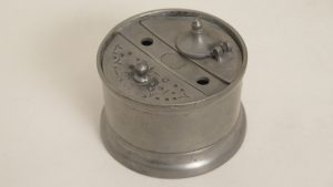 Ronde inktpot, H 5 cm, diam. 7,5 cm, met 2 compartimenten : één voor inkt met een scharnierend deksel, en één voor poeder, centraal 2 gaatjes van 6 mm. diam. voor de pennen. Merktekens van  J.-J. Dekeghel (meester in 1827, actief tot 1876)...