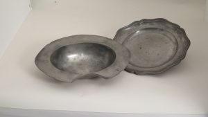 Scheerbekken, getand in het midden, met kleine steun voor de keel, 25,5 x 19,5 cm. Merkteken onderaan JDekeghel (D. 2147). - Plat bord, diam. 24 cm. Merktekens van J.J. Dekeghel (° 1797) 2 x onderaan : gekroonde roos met ster centraal en initialen...