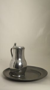 Ronde schenkkan met rond deksel, H 20 cm. Simpele duimrust, plat handvat, zonder schenktuit. Merkteken van Jan Nicolaes Speelmans (meester in 1752, gestorven 1787) op bodem : gekroonde roos met initialen NS (D. 2377). Eigendomsmerk : ADS. - Ronde...