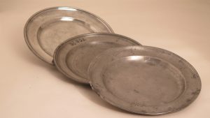 Plat rond à aile moulurée, diam. 33 cm. Poinçons à la face inf. : rose couronnée avec initiales LL (maître non identifié, maître en 1695) (D 2433) et château à trois tours encadré par les initiales IG (maître non identifié, reconnu maître en 1656) et LL superposées, daté [16]95 (D. 2428). - Plat rond à bord mouluré, diam. 30,5 cm. Poinçons à la face inf. d' E. ENGLEBERT (maître en 1706) : rose couronnée avec initiales [EE] (D. 2408) et château à trois tours encadré des initiales [E]E, daté "[17]06" (D. 2405a). - Assiette ronde, aile plate lég. oblique, moulure en-dessous du bord, diam 24,3 cm. Poinçonnage à la face inf. : château à 2 tours, initiales FP (maître non identifié, maître en 1750), daté "1750" (D. 2411) et rose couronnée avec initiales FP (D. 2412). Dans des rectangles : initiales IIF.