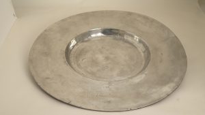 Grand plat "à la cardinal" à aile large, diam. 42,5 cm. Poinçons à la face inf. : rose couronnée avec initiales LL (maître non identifié, maître en 1695) (D. 2433) et château à 3 tours encadré par les initiales LL, date "1695" (D....