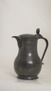 Ronde schenkkan op ingesnoerde voet, H 18,5 cm. Eenvoudig versierd, rond deksel, duimrust in schelpvorm, scharnierend handvat, versierde schenktuit. Merkteken van F. Coucke (actief 1772, gestorven 1797) op bodem : kroon met centraal grote initialen...