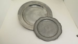 Platte schotel, met licht hellende rand, diam; 35 cm. Merktekens van R.C.H. Charlis (1782-1858) op bodem : gekroonde roos met centraal schild en initalen CC (D. 2597), St. Pieter staand met sleutel omgeven door inscriptie "R.C.H. Charlis" (D. 2596)...
