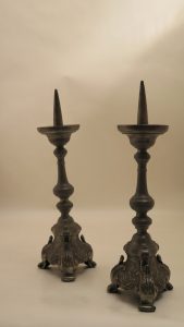 Paire de chandeliers pique-cierges sur 3 pieds, H 37,5 cm. Pieds décorés de feuilles et de coquilles; les listels qui les séparent sont ornés d’une feuille d’acanthe appliquée; tige pourvue de 3 nœuds moulurés. Poinçons de P. J....