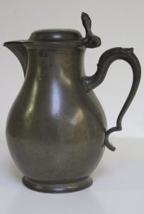 Schenkkan op voet, H 20 cm. Niet versierd, met rond deksel, gietbek, schelpvormige duimrust, scharnierend handvat. Merktekens van P. Cnops (meester in 1800) op bodem : wapen van Mechelen met St. Rombout met staf (D. 3210), gekroonde roos met centraal...