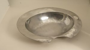 Grand plat à barbe, 39x31 cm, large échancrure sur un côté du marli, non décoré à sa face sup., décoré d’une moulure en volutes sur sa face inf. Un trou de suspension à une extrémité. 2 poinçons ovale à l’autre extrémité de la...