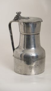 Pichet à épaulement sans piédouche, H 22 cm au col. Corps et gorge cylindriques, gobelet droit , col et panse ornés. Avec bec verseur, toit plat, poucier à 2 glands de chêne, charnière simple. Anse plate. Pase de poinçon de contrôle, ni...