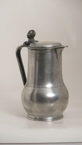 Pichet balustre sur faux piédouche, H 20,5 cm au toit. Gorge cylindrique décoré d'un filet, petit bec verseur, couvercle à toit plat surhaussé, poucier à coquille, anse plate. Poinçon de P. B. Choqueel (1723-1806) : rose couronnée avec...