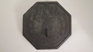 Cadran solaire octogonal, diam. 18 cm. Bordure en relief décoré. Au-dessus du style, représentation d’un disque solaire sous une représentation allégorique : 2 angelots ailés soutenant d'une main une couronne surmontant un blason...