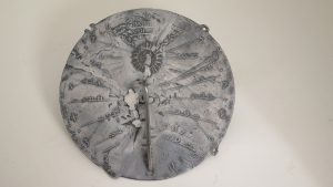 Cadran solaire rond, diam. 18 cm. 4 points de fixation en périphérie. Heures en chiffre arabes. Représentation d’un disque solaire au-dessus du style sous un cart. avec inscriptions en relief  "P.PAPII/A.DIION/1662" et dans le champ...