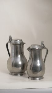 couronnée avec initiales (A)IC (maître non identifié). - Pichet balustre sur piédouche évasé orné, XIXe s., H 18 cm au col cyl., bec verseur terminé par 2 gouttes, couvercle orné de 2 cercles concentriques. Poinçonnage de Ch. Vrizet (1825-1860) : rose couronnée avec initiales illisibles (sans doute AIB, reprises de son prédécesseur A. J. Bis), "VRIZET" dans une dépression rectangulaire, palme de Douai dans un ovale. (2 pcs)