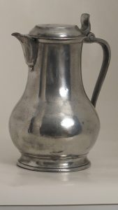 Pichet balustre sur piédouche, tout début XIXe s. H 24 cm. Col large, bec verseur, toit plat surélevé, poucier simple, anse plate. Beau poinçonnage de J.-B. Oudart (maître vers 1775) : rose couronnée avec initiales IBO, "OUDART A LILLE" dans...