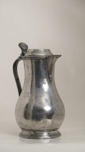 Pichet balustre sur piédouche évasé, H 26 cm au toit. Panse basse, gorge large, col marqué par un rebord plus épais, bec verseur reposant sur 2 gouttes, toit plat et surélevé portant plusieurs cercles concentriques, poucier en coquille,...
