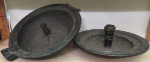 Moule à assiettes profondes à bord mouluré de 31 cm diam. et 5 cm de haut. Sur le bord sup. poinçonnage P (B ?). V.D.B. (non identifié) Anno 1749 et un décor floral. Pc. centrale ronde à sillons. - Moule à plats ronds profonds, marli chantourné et mouluré, diam. 32,5 cm, H 5,5 cm. 2 parties, bec verseur sur les 2 parties, pc centr. rectangulaire sans décor. (2 pc.)