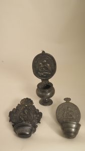 Bénitier à poser, H 22 cm. Large pied rond, court segment mouluré portant la cuvette pansue suivie d’un col rétréci et d’un bord plat. Pas de couvercle. Au grand dosseret ovale une Vierge à l’Enfant, dans une mandorle bordée d’une large frise de feuilles. - Bénitier à suspendre. Cuvette en cône inversé décoré. Sans couvercle. Au dosseret Vierge à l’Enfant : auréoles faites d’un pointillé en relief, cart. avec inscription "IESVS.MARIA" au-dessus des personnages entre 2 têtes d’angelots, mandorle bordée d’une large frise florale. - Bénitier à suspendre. Petite cuvette évasée, à fond convexe. Au dosseret Vierge à l’Enfant encadrée par 2 anges ailés; en haut, large coquille sous laquelle se trouve le trou pour la fixation murale.
