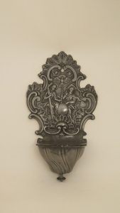 Bénitier à suspendre, H 18 cm. Cuvette en cône renversé décorée, couvercle articulé. Au dosseret, décoré de larges rocailles avec les initiales AW (maître non identifié), la Ste Trinité; au-dessus, 2 têtes d’angelots. A gauche le...