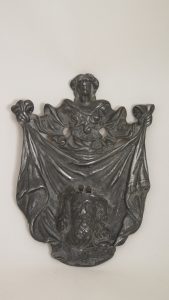 relief, Ste-Véronique les bras écartés, tenant de ses 2 mains les coins du St Suaire déployé jusqu’au bord inférieur de la plaque. Très rare.  Un autre ex. répertorié porte le poinçon de contrôle de 1701.