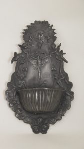 Grand bénitier à suspendre. Cuvette en forme d’hémi-vasque côtelée, implantée sur une large plaque où figure la Sainte Trinité: le Christ en croix surmonté de Dieu le père, lui-même surmonté du Saint-Esprit au centre d’un soleil...