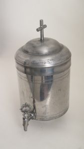Fontaine à eau bénite, France, centre indéterminé. Grand récipient cylindrique avec couvercle emboîté surmonté d’une croix. H cuve 18 cm, H totale 28 cm; diam. 16 cm. Cuve cylindrique ornée; couvercle mamelonné sommé d’une grande...