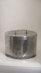 Réserve à eau bénite, Le Mans. Cuve cylindrique H 18,5 cm, diam. 27 cm. Pourvue sur la face interne de 2 anneaux mobiles, couvercle imboîté avec poignée rectangulaire, portant le poinçonnage : poinçons de P. Malmouche (maître au Mans en...