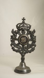 Ostensoir sur pied rond avec fine moulure, XVIIIe s. Surmonté d’une couronne sommée d’une croix et tenus par 2 anges. Transformé en reliquaire en ajoutant dans son centre une petite boîte ronde dont le pourtour est en métal argenté; il...