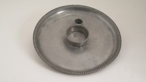 Plat de quête au rebord godronné. Fin XVIIe ou début XVIIIe s. Comporte un compartiment central cylindrique, et un autre juxtaposé, plus étroit, destiné à recevoir une chandelle. Poinçons à la face inf. : poinçon de contrôle d’Orléans...