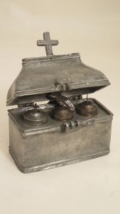 Boîte à Saintes Huiles, 12x4,5x5,8 cm. Centre indéterminé. La boîte est fermée par une plaque percée de 3 trous où s’emboîtent 3 burettes (probablement postérieures) en métal argenté, dont les couvercles portent une croix; ils sont...