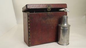 Réserve à Saintes Huiles, France, centre indéterminé. Coffret en bois recouvert de cuir clouté sur les bords verticaux de la face antérieure. Contient 3 réserves cylindriques H 11 cm, diam. 6,5 cm, prolongées par un col haut de 5 cm...