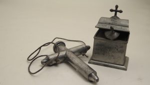 1 compartiment, petit coffret H 45 mm, sur pied 7x5 cm. Couvercle hémi-cylindrique surmonté d’une croix faîtière. Fermé par une plaque d’étain percée d’un orifice où se loge une burette dont le couvercle est muni d’une spatule. Inscription gravée sur la face antérieure : "YNF." et "N" (Oleum Infirmorum). - Paire de burettes à l’huile des malades, H 7 cm, cylindriques à bouchons vissés de forme ogivale surmontés d’une courte tige qui portait certainement une croix enlevée secondairement. Origine indéterminée. A l’int. se trouve une ampoule cyl., avec bouchon vissé surmonté d’une croix, et portant sur sa face inf. une spatule qui plonge dans l’ampoule. Initiales "O" et "I" gravées sur le couvercle des ampoules. Ref. Bidault p. 52. (3 pcs)