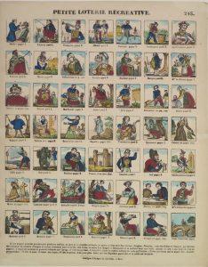 Feuilles de jeux destinées à être découpées, avec les règles du jeu impr. dans la marge inf. Epinal : Loterie parisienne, post 1855 (le Palais de l'Industrie qui gagne tout fut construit pour l'expo de 1855), n. 1689, 72 cases. - L'exposition [i.e. l'exposition universelle de 1867 à Paris], n. 1692, 64 cases. - Loterie des rois de France, post 1870 ? (Napoléon Ier gagne 20, Napoléon III perd 80, Charlemagne gagne tout), n. 1684, 72 cases. - Loterie des arts et métiers, s.d., n. 1691, 64 cases. - Petit jeu de loterie militaire pour les enfants, s.d., n. 455, 49 cases. - Loterie alphabétique des cris de Paris, c. 1890, n. 1674, 100 cases. - Loterie alphabétique militaire, s.d., (Mac-Mahon gagne tout), n. 1676, 100 cases. Metz : Loterie des souverains. Aux cent petite images, 2nd Empire (Napoléon III gagne tout), n. 546, 100 cases. Sans les règles du jeu. - Petite loterie récréative, s.d., n. 245, 49 cases. - Loterie de Sébastopol, 2nd Empire (Napoléon III gagne tout), n. 395, 49 cases.
