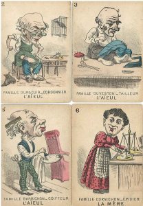 Jeux des 7 familles, France, fin XIXe s., lithographie rehaussée, 9,9 x 6,7 cm, coins arrondis, 42/42 cartes. Dos : bleu turquoise. Famille Bonveau (boucher), Duracuir (cordonnier), Duveston (tailleur), Lapalette (peintre), etc. Coin sup. gauche de l'aïeule Bonveau manquant, traces d'usage. - [Jeu de Mlle Lenormand], France, fin XIXe s., chromolith., 8,8 x 5,6 cm, coins arrondis, 36/36 cartes, coins dorés. Dos : écossais bleu foncé et rouge. - [Jeu des Alliés, Turnhout, Biermans, c. 1919], chromolith., 9,3 x 6 cm, coins arrondis, 52/52 cartes, tranches dorées. Dos : ornementé en bleu. Etui muet couvert de papier bleu. Jeu à 2 têtes (Belgique/ Etats-Unis, Italie/Serbie, Roumanie/ France, Angleterre/ pays du Commonwealth sur les rois), double motif sur les as.