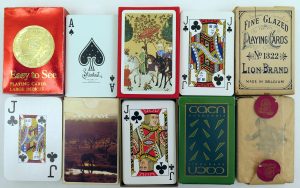 Jeux aux portraits français, anglais, belge, américain, espagnol..., certains à 2 têtes, certains à enseignes latines, la plupart avec jokers ou as décorés ou illustrés. Liste complète jointe.
