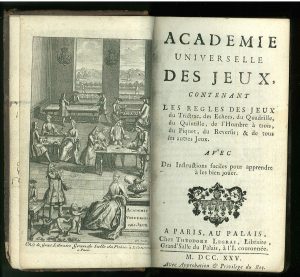 Académie universelle des jeux, contenant les regles des jeux du trictrac, des échecs, du quadrille, du quintille, de l'hombre à trois, du piquet, du reversis (...). Avec des instructions faciles (...).