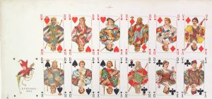 Feuille d'un jeu de 13 cartes, à 2 têtes, enseignes françaises, chromolith. France, Grimaud, s.d.  (i.e. 1860 ?), 20 x 44 cm, cartes 8 x 5 cm. Dos : croisillons bleu et blanc. Min. défauts marg.