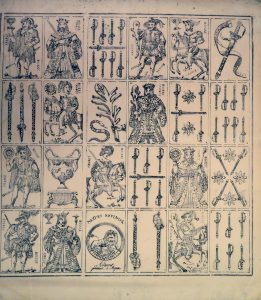 Feuille d'un jeu de 24 cartes, en pied, enseignes espagnoles, lithogr. non rehaussée. Bordeaux, Boisse, 1850, 40 x 35 cm, cartes 8 x 5 cm. Dos blanc. Montée par le bord sup. sous passe-partout. Bonne condition.