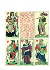Tarot animalier non signé, Gand ?, fin XVIIIe-début XIXe s. En pied, gravé sur bois et rehaussé au pochoir, 11,4 x 5,9 cm, coins carrés, 78/78 cartes. Dos : motif losangé, rouge sur fond blanc. Bonne condition.