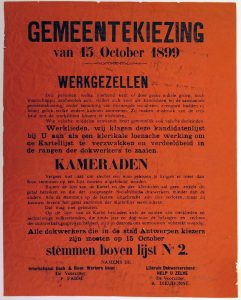 Interessant geheel van verkiezingsdrukwerk en politieke éénbladdrukken : Raedt-getuyg om schatten te vinden. S.l., s.d., 21 x 25 cm. Politiek pamflet t.t.v. de Brabantse Omwenteling. Verso idem in het Frans. - Aen de Kiezers van Audenaerde, Audenaerde, drukkerij Van Bevernaege-Van Eechaute, 1860, 36 x 25,5 cm, 2 bl. - Gemeenteverkiezing 1899. Strijlustige oproep om te stemmen op de kartellijst. - Ypersche Pompiers. Geschiedenis en gebeurtenis. Dubbel blad., sterk gebruind en vervuild. - Eene nieuwe beoordeling van het gedicht van J. Van Beers. Aalst, A. Byl, s.d., 45,5 x 33 cm. -  Verklaring van de Conservatieve opinie. D. Greuse, 1852. Tekst in het Nederlands en het Frans. - Napoléon III au tribunal de l'histoire. Fourmies, Bachy jeune, s.d. Scherpe tekst van republikein tegen Napoléon III. - Atlas. Protestprent, 29 x 36,4 cm, gekleurd. Met verklarende tekst in het Nederlands en Frans. - Het Vrije Woord, 23 en 30 mei 1890. 2 eerste nummers van dit Gent's liberaal verkiezingsblad. - La Soirée. Feuille dessinée et coloriée par Roufrouf. S.l., s.d., 44,5 x 52,5 cm. - Gentse karikatuur. - Belgische omwenteling, 1830, 2 lithos. Veel roestvlekjes. - Les Noces de Jupiter. Gent, c. 1874 ? Gentse  spotprent met pen getekend. Vlekken, rechter boven hoek gescheurd en hersteld. Plooi verstevigd aan verso. Op verso enkele potloodschetsen.