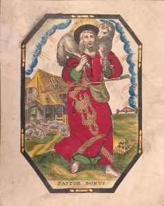 Pastor bonus, peau de vélin, habillée et gouachée. - [Marie-Madeleine] par H. Wierix, papier monté sur peau de vélin, habillée et gouaché, cernée d'un fin cadre de paille. Jolie pièce. - [Saint Joseph et l'enfant Jésus], id., (petit manques au cadre de paille). - S. Juan Evangelista, soie et papier montés sur peau de vélin, habillée et gouachée, paillettes micacées. - Gelobt seÿ Jesus Christus par C. Harrer, papier, petit fragment de textile et découpes de papier métallisé peint.