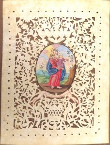 Maria, peau de vélin, médaillon gouaché entouré d'une importante dentelle. Jolie pièce. - S. Philibus, papier, médaillon gouaché, dentelle finement piquetée. Saint africain ? (visage et main noirs). - Ecce Homo, papier, fond piqueté. - Non ident., papier, bords lobés, dentelle finement piquetée. Joint : Fragment central d'un canivet, papier, 6,4 x 3,5 cm, avec médaillon gouaché figurant Ste Agathe (?) et pourtour ajouré. (5 pcs)