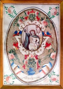 1. Een engelbewaarder legt een beschermende arm rond een kind op de centrale gouache in een ovalen medaillon omringd door fijn kantwerk met florale motieven. 2. In een ovaal veld omlijst met een goudkleurig randje, zit centraal de lijdende Christus met achter hem een schriftgeleerde die een mantel rond zijn schouders legt. De gouache is omringd door een breder kantwerk met bloemmotieven en vogels, onderaan een blauwe vaas met rozen en rode bloemen op een banderolle met de titel. Het geheel opgevuld met fijn kantwerk. De hoeken buiten het ovaal zijn opgevuld met 4 roze rozen.
