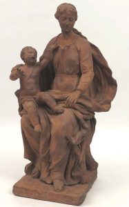 Madonna met kind, 18de e. Terracotta, c. 47 x 23 x 20 cm. Restauratie aan de hals van de Madonna, enkele barsten in de terracotta op de rugzijde, klein verglaasd stukje aan de wapperende jas.